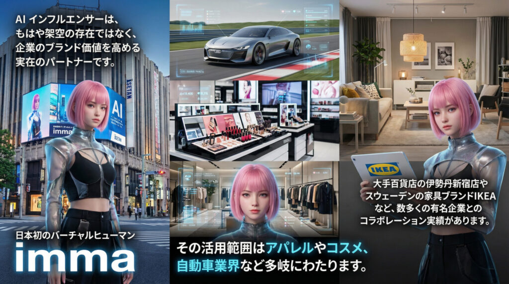 例えば、日本初のバーチャルヒューマンとして有名な「imma(イマ)」は、そのリアルな質感とファッション性で世界中から注目を集め、大手百貨店の伊勢丹や自動車メーカーのPorsche Japanなど、数多くの有名企業とコラボレーション実績を持ちます。